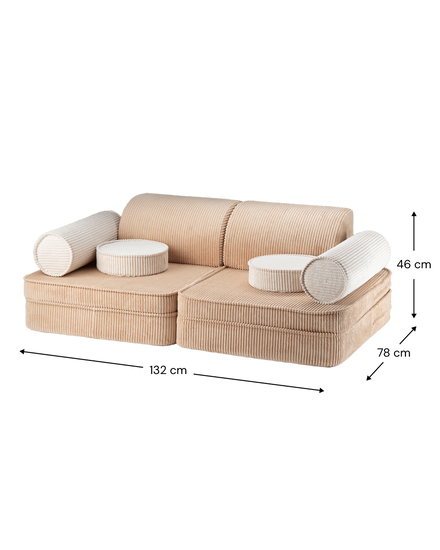 Este settee está compuesto por 9 piezas modulares: dos cojines de asiento, un cojín grande, dos cojines triangulares como respaldo, dos cojines cilíndricos a modo de reposabrazos y dos cojines redondos. La combinación perfecta para fomentar la imaginación y el confort, permitiendo crear configuraciones infinitas según el momento o la creatividad del pequeño usuario.