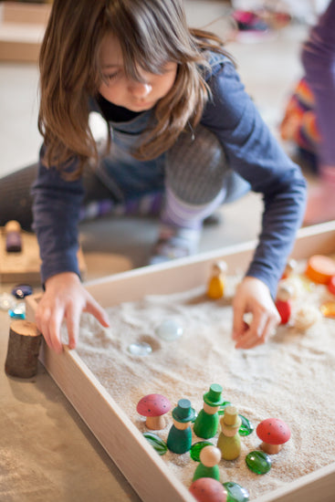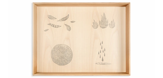 Una caja de madera fabricada en madera de haya (45x65x7cm) con los 4 elementos de la naturaleza estampados artesanalmente. Este material se utiliza para contener el juego. Se convierte en un marco de acción que controla y pone límites a los elementos y espacios del juego infantil. Esta caja ayuda a crear un espacio aislado y cerrado que mejora el cuidado y el respeto hacia la acción dentro de ella. La caja se convierte en un juego sensorial cuando se llena de arena, harina, sal, arroz, etc. Al fondo, hay unas imágenes estampadas que evocan los cuatro elementos de la naturaleza: tierra, agua, aire y fuego. Estos elementos forman parte de nuestra especie y nos hacen conectar con la naturaleza. La alegoría a estos elementos también puede utilizarse como espacio de juego o como invitación a organizar y clasificar.