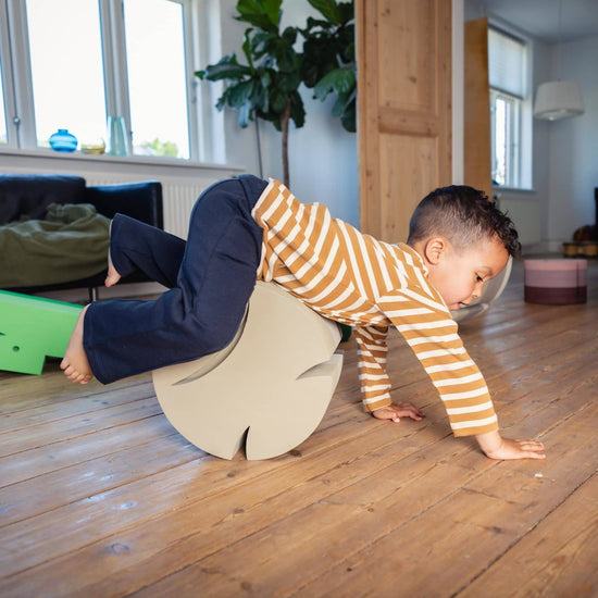 Al principio, el bebé puede disfrutar rodando sobre el costado de bObles Fish, que fortalece el cuello y la espalda, un gran ejercicio para hacer durante la baja por maternidad o paternidad. Más tarde, tu bebé podrá practicar de pie con el apoyo y la ayuda de bObles Fish. Su niño desafía el equilibrio sentándose con las piernas cruzadas en bObles Fish.