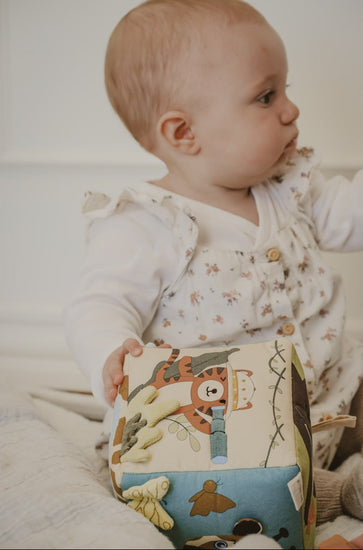 ¡Agita, aprieta y descubre! El Fabric Cube – Safari es un suave cubo de actividades sensoriales repleto de pequeñas sorpresas que invitan al bebé a explorar. Sus texturas variadas, solapas, etiquetas y adorables animales de safari en tonos tierra y relajantes despiertan la curiosidad y favorecen una experiencia de juego calmada y envolvente.