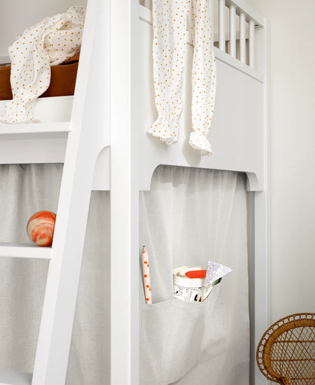 La cortina para literas y camas semi-altas Seaside está diseñada para colocarse bajo la cama y transformar el espacio inferior en un rincón acogedor y funcional dentro de la habitación infantil. Su diseño incluye una puerta, una ventana y un bolsillo de tres compartimentos, ofreciendo espacio adicional para guardar libros, juguetes u objetos pequeños.