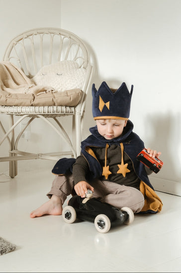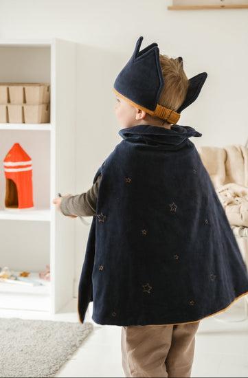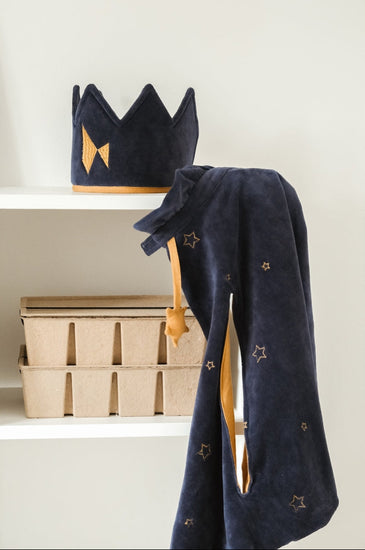 Confeccionada en un suave tejido aterciopelado azul con detalles elegantes, esta capa transforma al instante a los más pequeños en auténticos soberanos del reino.