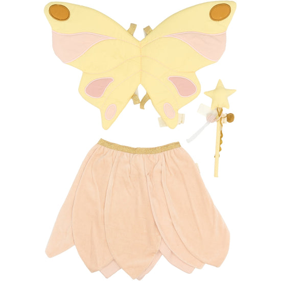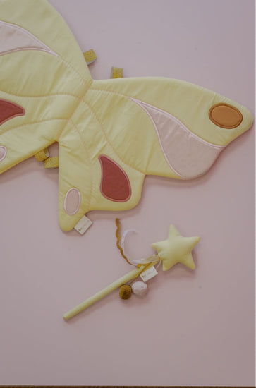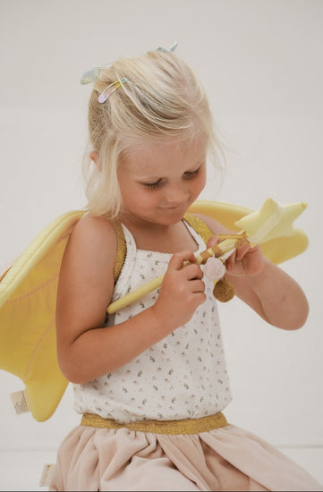 Deja que tu pequeño o pequeña se sumerja en su propio mundo encantado con el Set de Disfraz de Hada Fairyland de Fabelab, que incluye unas alas brillantes, una varita mágica con estrella y una falda suave y flexible con cintura elástica dorada.