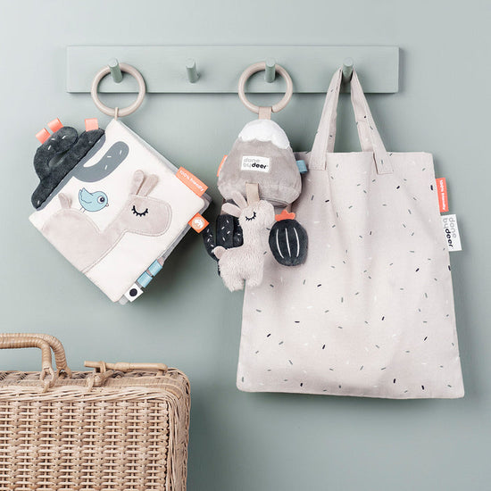 Gracias a su diseño ligero y fácil de sujetar, se acopla con comodidad al cochecito, la sillita de paseo o un centro de actividades, convirtiéndolo en el accesorio perfecto para mantener al bebé entretenido en cualquier lugar. Sus tonos arena, cálidos y atemporales, combinan a la perfección con cualquier estilo.
