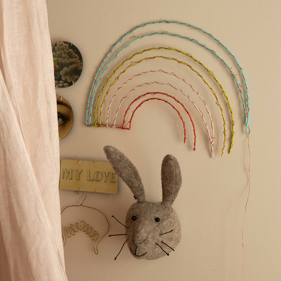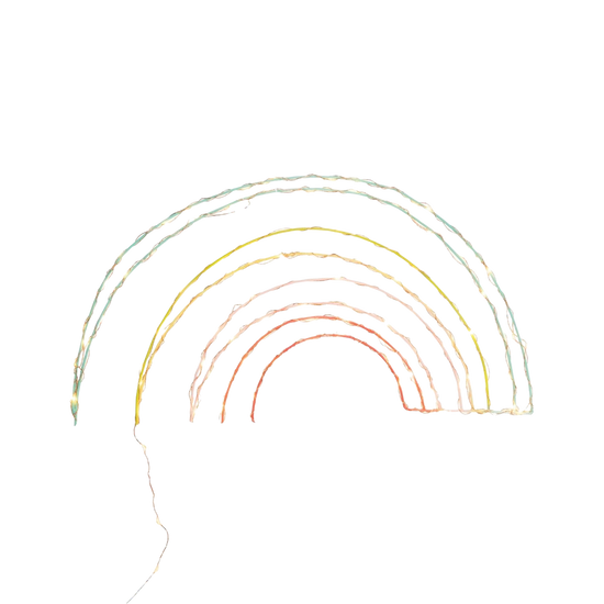 Una delicada lámpara de pared infantil con forma de arcoíris, creada por la artista parisina Zoé Rumeau. Esta pieza hecha a mano aporta un lenguaje poético y luminoso a los espacios infantiles, transformando la pared en un elemento lleno de sensibilidad y color.