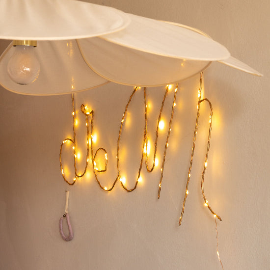 Una delicada lámpara de pared infantil con la palabra Dream, creada por la artista parisina Zoé Rumeau. Una pieza hecha a mano que combina iluminación y mensaje, aportando poesía, calidez y un toque artístico a los espacios infantiles y a cualquier rincón del hogar.