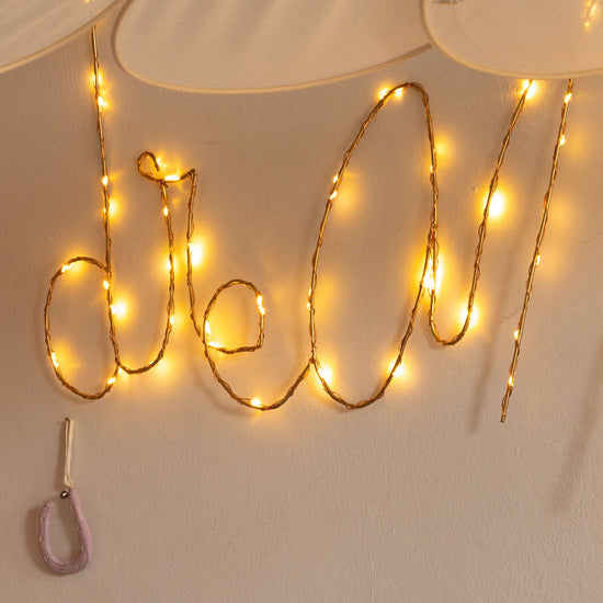 Esta lámpara decorativa de pared emite una luz suave y envolvente, ideal para crear ambientes tranquilos y acogedores. Su diseño tipográfico en acabado dorado convierte la pared en un elemento protagonista, perfecto para dormitorios infantiles, zonas de juego o espacios creativos que buscan piezas con significado.