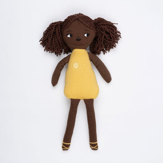 Sol es una Fab Friend juguetona con la que crear experiencias maravillosas allá donde vayas. Tiene detalles encantadores como un sol en el pecho, el pelo rizado, un mono divertido y unas sandalias amarillas muy monas. Su tamaño perfecto para abrazar la convierte fácilmente en la mejor amiga de tu peque.