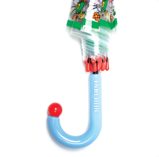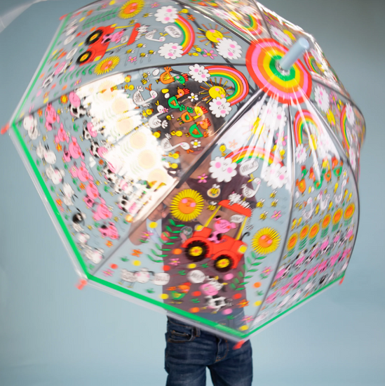 Un paraguas infantil transparente inspirado en el mundo de la granja, con divertidos animales de granja que acompañan a los más pequeños en los días de lluvia. Un diseño alegre y lleno de color que convierte cualquier paseo bajo la lluvia en un momento divertido.