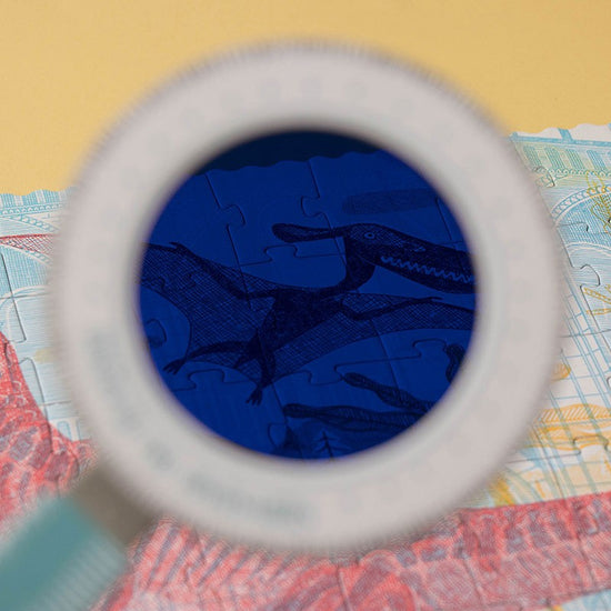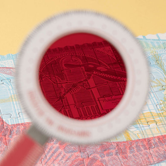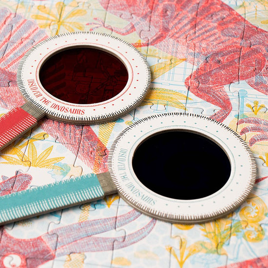 Un puzzle de 200 piezas muy original, con la lupa roja viajarás al Jurásico y con la lupa azul entrarás en el museo de ciencias naturales.