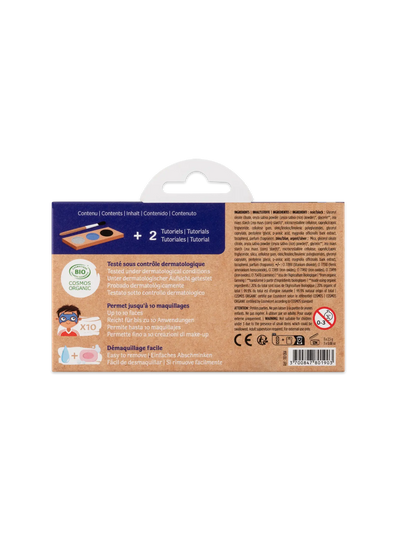 Modo de empleo: El maquillaje se usa con agua y se aplica sobre la piel con el pincel. El desmaquillado se realiza fácilmente con agua tibia y un poco de jabón. Después de su uso, deje el pincel y la paleta de sombras que se sequen antes de guardarlos en la caja.