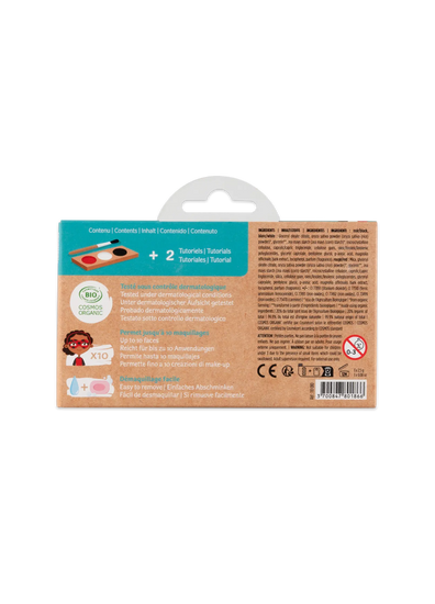 Modo de empleo: El maquillaje se usa con agua y se aplica sobre la piel con el pincel. El desmaquillado se realiza fácilmente con agua tibia y un poco de jabón. Después de su uso, deje el pincel y la paleta de sombras que se sequen antes de guardarlos en la caja.