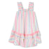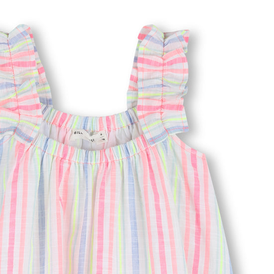El vestido de algodón a rayas BILLIEBLUSH es pura alegría infantil: tirantes fantasía que se mueven con cada paso y volantes delicados con lentejuelas en el bajo que aportan un toque de brillo juguetón. Comodidad y estilo se combinan para acompañar juegos y salidas, ofreciendo una silueta ligera llena de carácter que a las más pequeñas les encanta llevar.